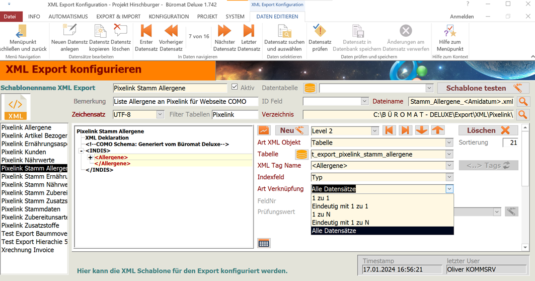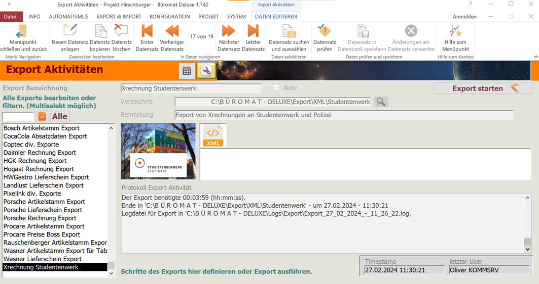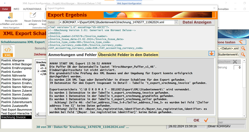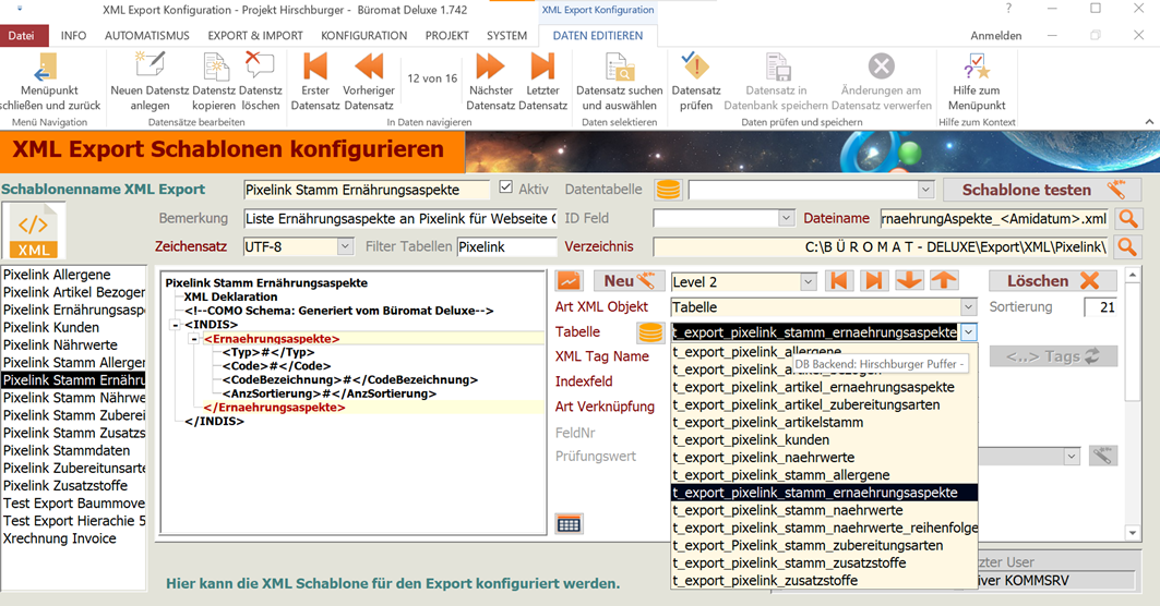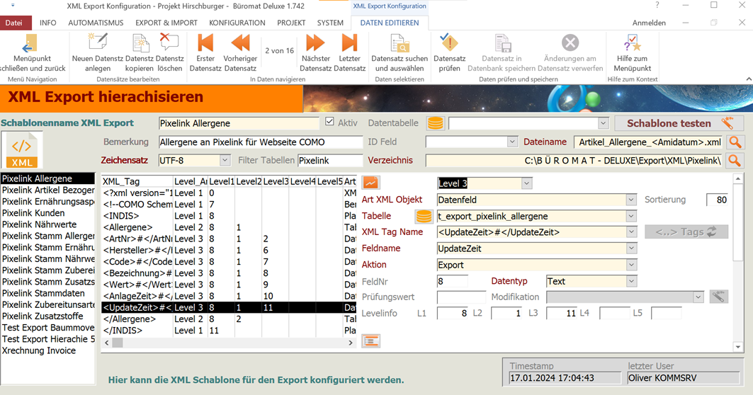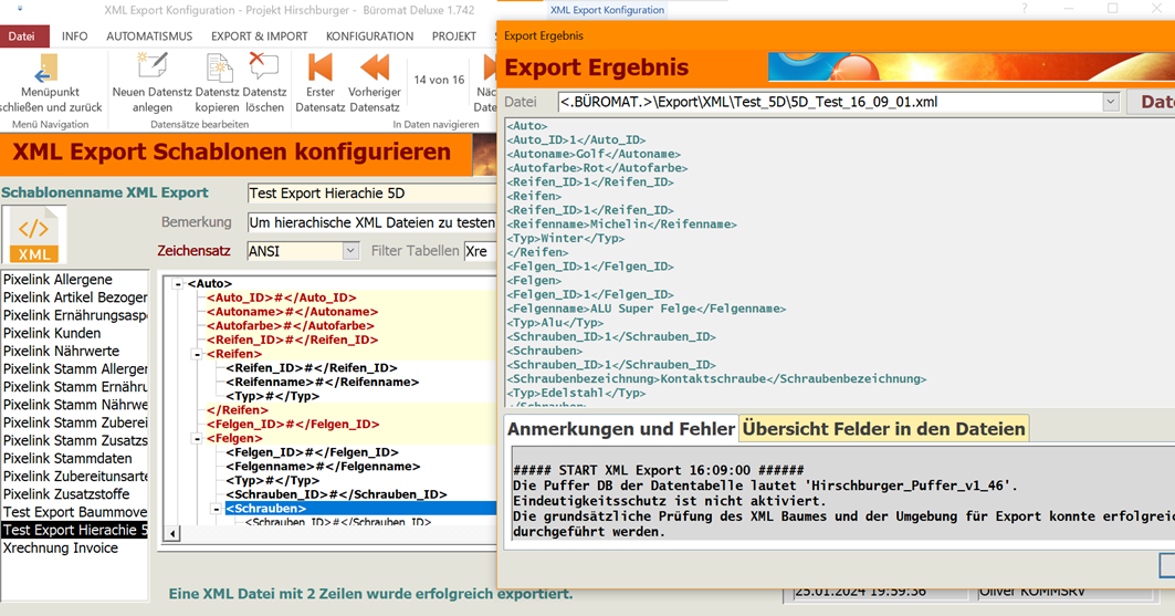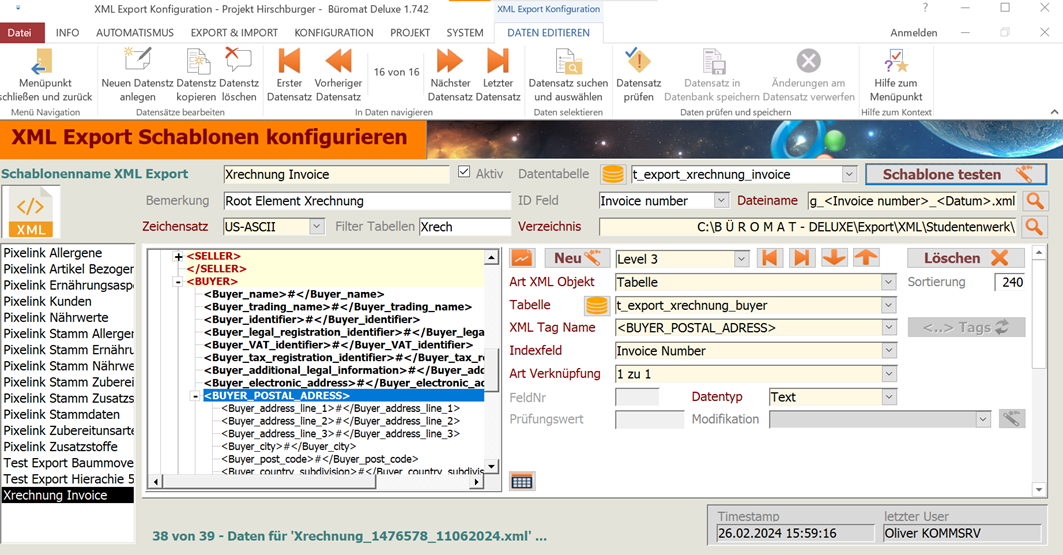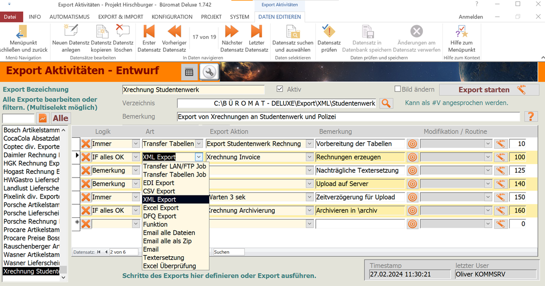 Dieses Modul ‚XML Export‘ ermöglicht den Export von ACSII Text Dateien im XML Format in ein Exportverzeichnis des Büromat Deluxe.