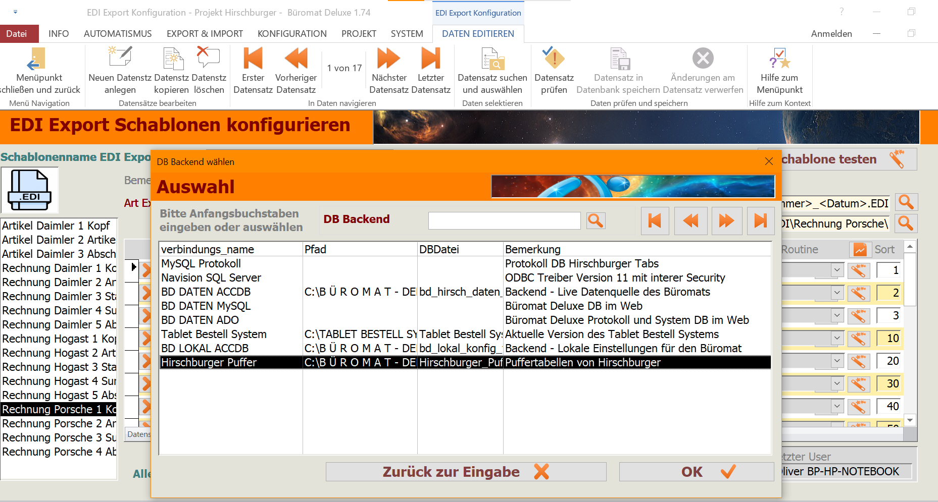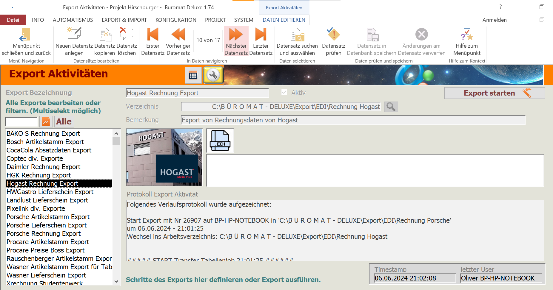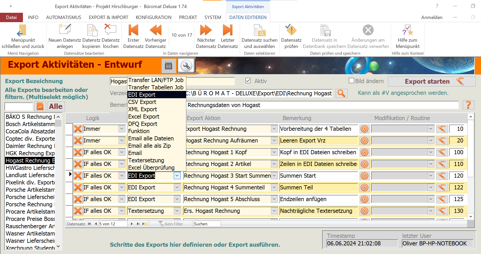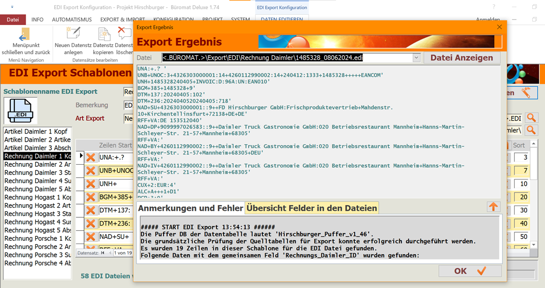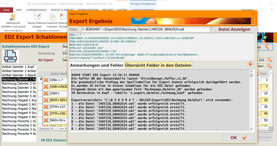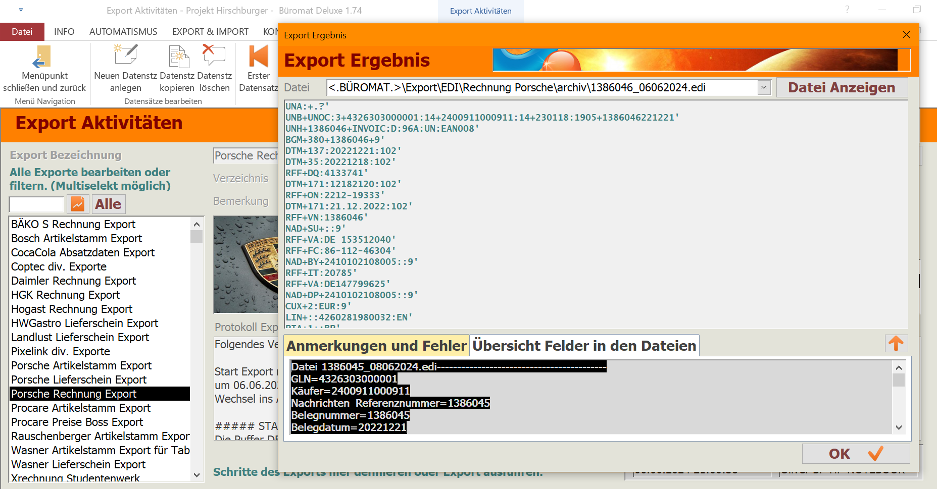 Dieses Modul EDI Export‘ ermöglicht den Export von ACSII Text Dateien im EDI Format in ein Exportverzeichnis des Büromat Deluxe.