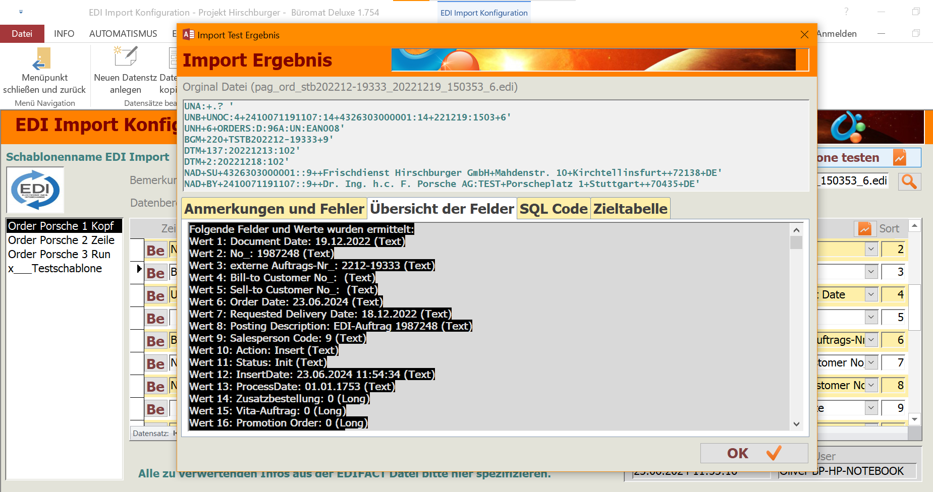 Hier ein Teil eines Beispiels einer EDI-Datei für den Datenaustusch von Rechnungen zwischen der Porsche und Hirschburger Frischdienst GmbH: (Zeilenumbrüche nur zu besseren Sichtung der EDI Datei)